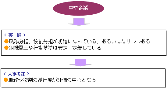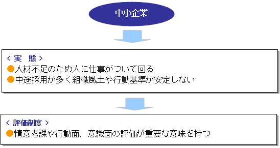 中小企業においては、人に仕事がついて回るという傾向があります。また社員の入社退社が多く、組織風土が安定しないという特性があります。